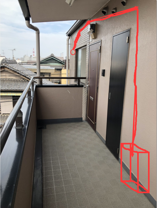 現場写真を撮って頂き、配管ルート、置き場所などを一緒に考えた結果イメージ図の様に廊下に置くことにして、工事日を決めました。